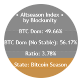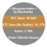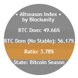 Il est toujours très important en tant qu’investisseur de faire attention aux différentes rotations du marché crypto. Cet index permet de visualiser facilement s’il est préférable en termes de performance de détenir du Bitcoin ou bien des Altcoins. Pour ce faire, il calcule un ratio prenant en compte les performances de plusieurs dizaines d’Altcoins versus celles de Bitcoin, permettant d’indiquer une saisonnalité. Il donne aussi la dominance du Bitcoin dans la capitalisation globale du marché crypto, ainsi que celle omettant les Stablecoins.